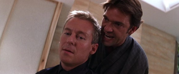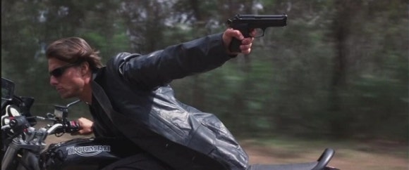 영화의 백미는 오토바이 추격신과 절벽 위 결투입니다. 이선은 션의 본거지를 추적해 바이러스를 회수하고, 격렬한 전투 끝에 션을 처치합니다. 특히 이 장면은 존 우 감독 특유의 슬로우모션 액션과 상징적인 흰 비둘기 연출로 강렬한 인상을 남깁니다.